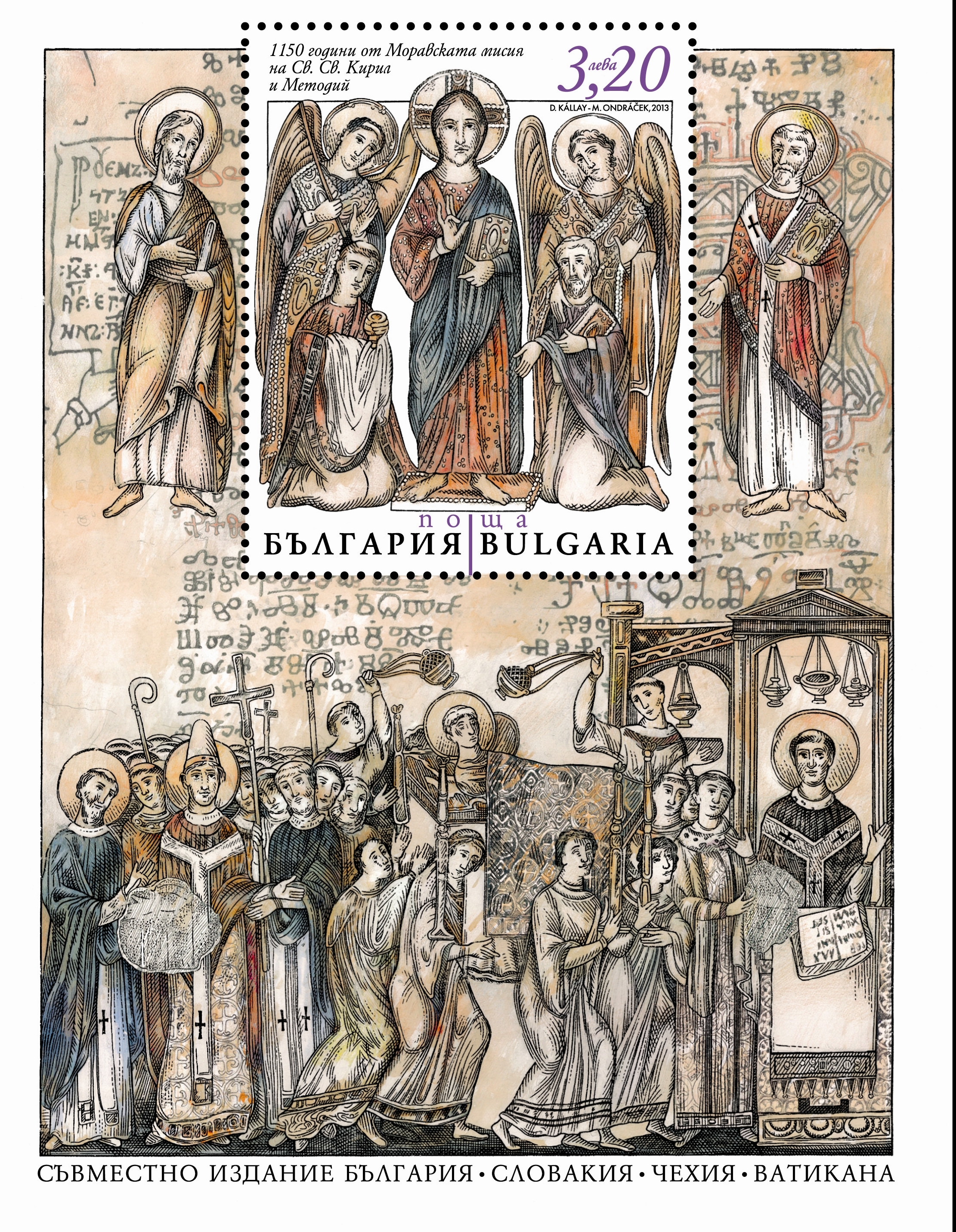 Марка с номинална стойност 3.20 лв., илюстрован пощенски плик и специален печат – това включва пощенско-филателното издание, посветено на знаменателните 1150 години от моравската мисия на братята Кирил и Методий. Марката се тиражира в 40 000 броя, а тиражът на илюстрования плик е 1389 броя, съобщиха днес при представянето на юбилейното издание от Български пощи.