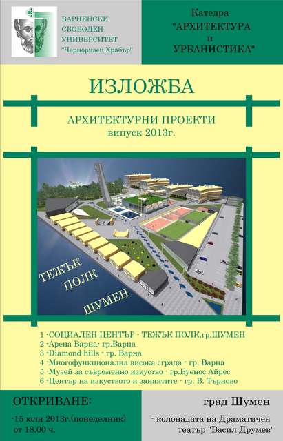 Фокусът на изложбата е върху шумеснкия проект – „Социален център със спортно-развлекателен парков комплекс“. Началото му е поставено през 2011 година, когато областният управител на Шумен Димитър Александров инициира провеждането на първа дискусия за бъдещето на военните имоти. В дискусията са представени различни предложения от специалисти в областта на архитектурата. Арх. Росица Пеева – преподавател във Варненския свободен университет представя идея за разработване на проекти от студентите по архитектура в университета, като по този начин да бъдат представени вижданията на младите хора за това пространство. Присъстващите се обединяват около мнението, че паркът в бившето военно поделение трябва да се запази и голяма част от имота трябва да се използва за спортни нужди, като може да бъде изграден спортно-развлекателен център. Трима студенти-дипломанти, под ръководството на проф. д-р арх. Константин Бояджиев, започват разработването на проекти още през учебната 2011-2012-та. Първият завършен дипломен проект, представен в настоящата изложба, е част от магистърската теза на студента от Шумен Тодор Христов, “Магистър по „Архитектура” във ВСУ. На защитата присъства Областният управител на Шумен, г-н Димитър Александров, който пред комисията и аудиторията изказва задоволство от идеите в проекта, осигуряващи необходимата градска среда в този район, и изразява желание съгражданите му също да се запознаят с проекта. Проектът показва резултата от почти двегодишен труд, положен с мисъл и творчество, с желание и любов от шуменци за шуменци, коментират от ВСУ.