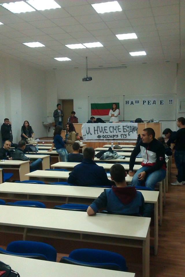 И студентите от ПУ “Паисий Хилендарски” окупираха зала в Ректората. Това е 5-та аудитория, до която достъп след окупацията получаваха само младежи, които могат да удостоверят, че са студенти. Акцията е денонощна и е в подкрепа на колегите им от Софийския университет, написаха в нарочна декларация момчетата и момичетата от ПУ. Повечето от тях са третокурсници от специалността политология, но сред тях има от всички останали специалности.