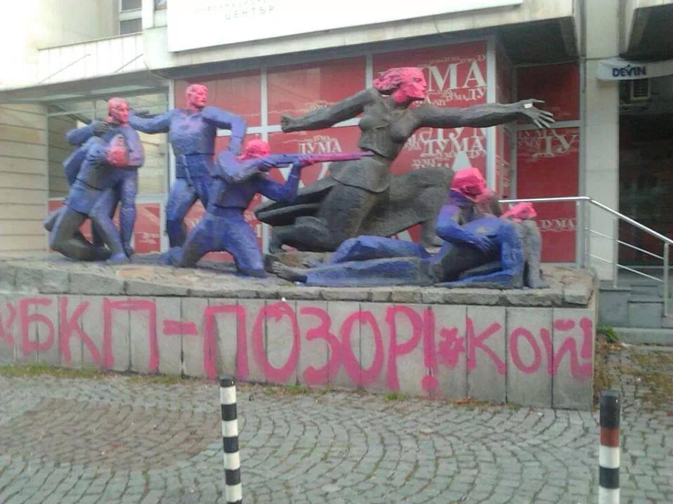 Фигурите от композицията пред офиса на БСП на “Позитано”20 в столицата осъмнаха, боядисани в розово, а художниците, между които добилият популярност напоследък като протестър Асен Генов – в ареста. Причината за цветната акция е 7 ноември, дата, на която по време на социализма се честваше Великата Октромврийска социалистическа революция.