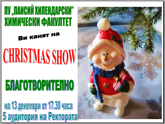 Благотворително може да бъде и едно… научнoизследователско шоу – това ще докажат студентите и преподавателите от Химическия факултет на Пловдивския университет „Паисий Хилендарски“ на 13 декември, петък, от 17:30 часа. В 5-а аудитория на Ректората младите химици са подготвили зрелищно представяне на любимата си наука и срещу символична такса за вход на зрителите искат да подкрепят 20 годишната си колежка Мария Даракчиева.