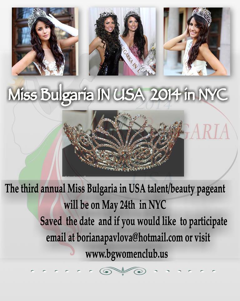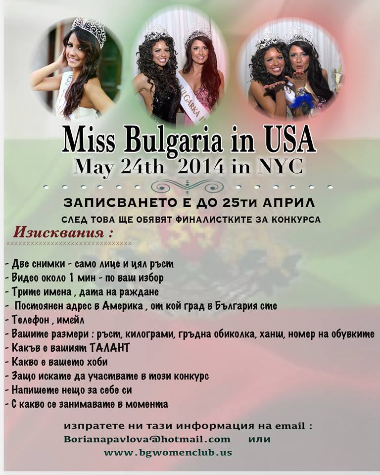 missКрасивите българки в Америка вече могат да се записват за участие в конкурса Мис България в САЩ 2014, съобщи за F2F TV чаровната му създателка Боряна Павлова, председател на Българския Дамски Клуб в Ню Йорк. 25-ти април е крайният срок, до който на мейлаBorianapavlova@hotmail.com или на сайта на женския клуб претендентките за короната могат да заявят желанието си участие. То трябва да е придружено с две снимки – в лице и цял ръст и още:
