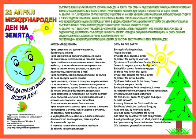 PlakatKletva copyБългария е първата държава в света, която празнува Ден на Земята. Това става на 14 декември 1930 г. по инициатива на  тогавашния министър на земеделието и държавните имоти Григор Василев. Неговата идея е подета и от колегите му в цяла  Европа. Това припомнят от сдружение „Движение с екологична насоченост” Ямбол в Деня на  нашата планета, определен години по-късно от световната общност да е 22 април. Това се случва през 1990-та или 60 години по-късно.  Днес историята на този ден децата и учениците от Ямбол могат да проследят в постери.