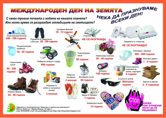 PlakatWaste copyДруг от плакатите е посветен на вредното въздействие на най-разпространените отпадъци от опаковки върху почвата и водата.  Така най-младите жители на Ямбол днес научиха, че станиолът, с който е опакован любимият им шоколад; стиропорът, от който са изработени чинийки и чаши за еднократна употреба, не се разграждат. И още – алуминиевите кутийки от безалкохолно и бира тровят Земята от 80 до 250 години, пластмасовите бутилки – от 450 до 700 години, батериите – 100 години, а цигарените фасове – от 10-12 години.