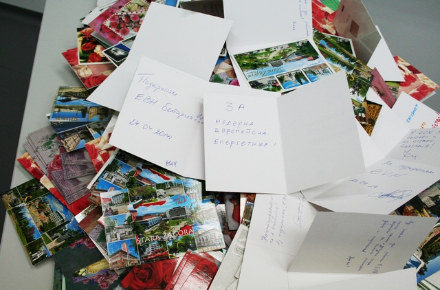 Синдикалните организации в EVN България организираха нестандартна акция, за да покажат несъгласието си с основанията за стартираната от ДКЕВР процедура за отнемане на лицензията на електроразпределителното предприятие. Представители на Национална федерация на енергетиците – КНСБ, Фирмена синдикална организация – Федерация „Енергетика“ – КТ „Подкрепа“, Независима синдикална федерация на енергетиците в България – КНСБ и СЕБ – Съюз на енергетиците в България купиха цветни картички и ги раздадоха на всички свои членове, работещи в EVN България Електроснабдяване, за да кажат своето мнение за евентуалното му затваряне.Така посланието към Енергийния регулатор на всеки служител, написано собственоръчно, днес беше внесено в деловодството на ДКЕВР точно в 11:30. Синдикалистите се надяват председателят на ДКЕВР Боян Боев, до когото са адресирани всички над 1 600 картички, да успее да прочете всяка от тях. Надеждата ни е, че ще бъде взето единственото разумно решение, а именно прекратяване процедурата по отнемане на лицензията, защото предприятието е коректен работодател, даващ хляб на хиляди семейства, крупен данъкоплатец за държавната хазна и част от енергийната сигурност на страната, коментират синдикалистите.