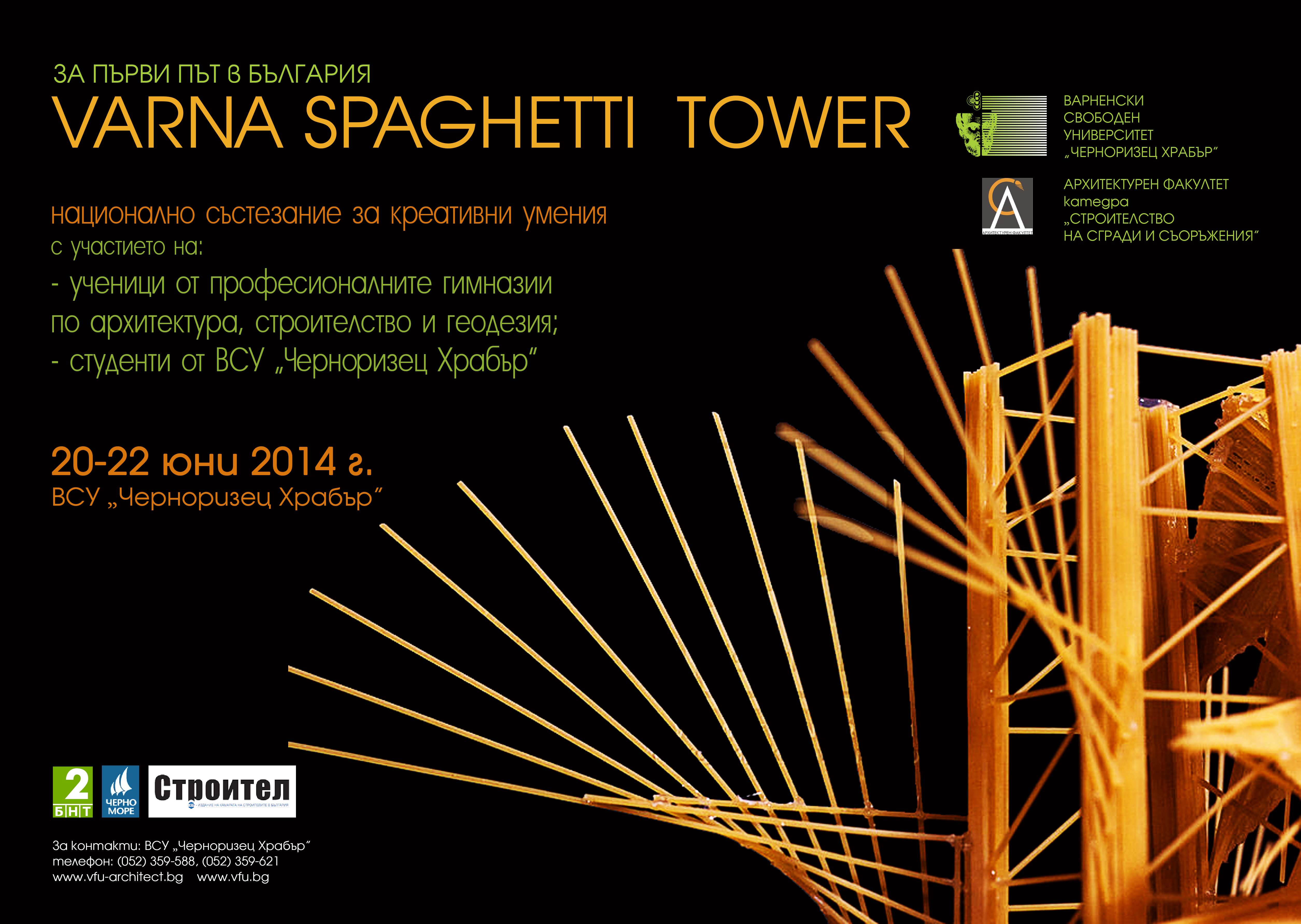 Първото национално състезание за креативни умения с атрактивното наименование Varna Spaghetti Tоwer е организирано по идея на катедра „Строителство на сгради и съоръжения“ към Архитектурния факултет на Варненския свободен университет „Черноризец Храбър“. То ще събере ученици от професионалните гимназии по архитектура, строителство и геодезия от цялата страна и студенти на ВСУ в опит да провокира креативното им мислене в проектиране и изграждане на кули от… спагети.