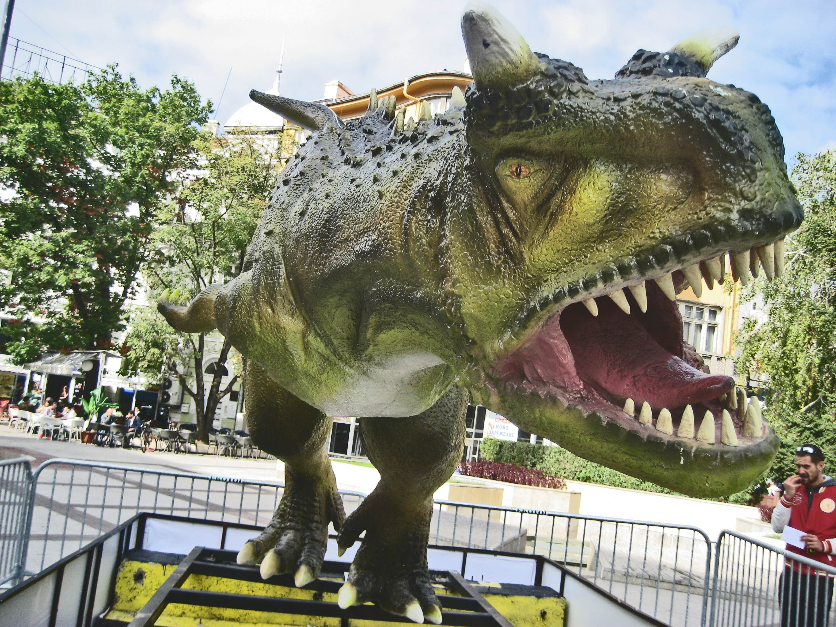 Карнотавърът, висок 3м и дълъг 8м, който вдъхва страхопочитание у минувачите пред Община Бургас, е един от експонатите с внушителни размери, които организаторите са включили в образователната изложба.