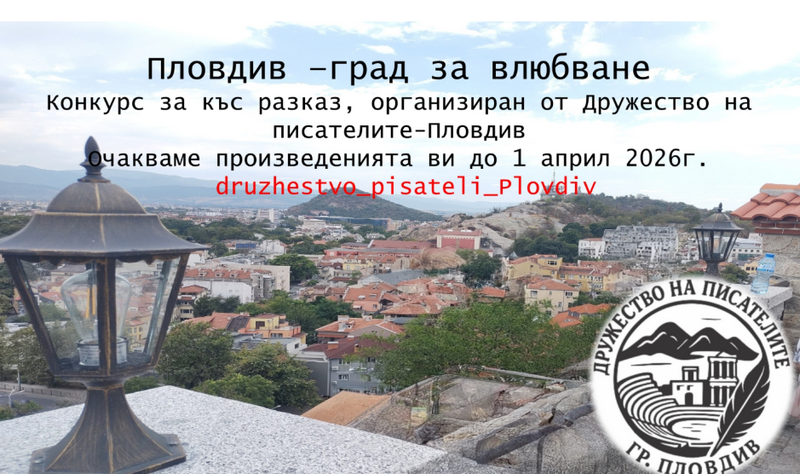 Дружеството на пловдивските писатели кани за участие в конкурс за къс разказ всеки, който пожелае да се състезава със свой текст по темата „Пловдив – град за влюбване“. Разказът не трябва да е публикуван, а обемът му се очаква да е до 700 думи. Според регламента е необходимо текстовете да са авторски – без намеса на изкуствен интелект – и да не са участвали в други конкурси.